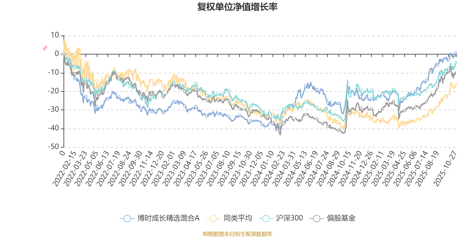 截至10月27日,博时成长精选混合A近三个月复权单位净值增长率为9.34%,位于同类可比基金40/49;近半年复权单位净值增长率为32.26%,位于同类可比基金28/49;近一年复权单位净值增长率为25.90%,位于同类可比基金28/42;近三年复权单位净值增长率为46.10%,位于同类可比基金7/29。