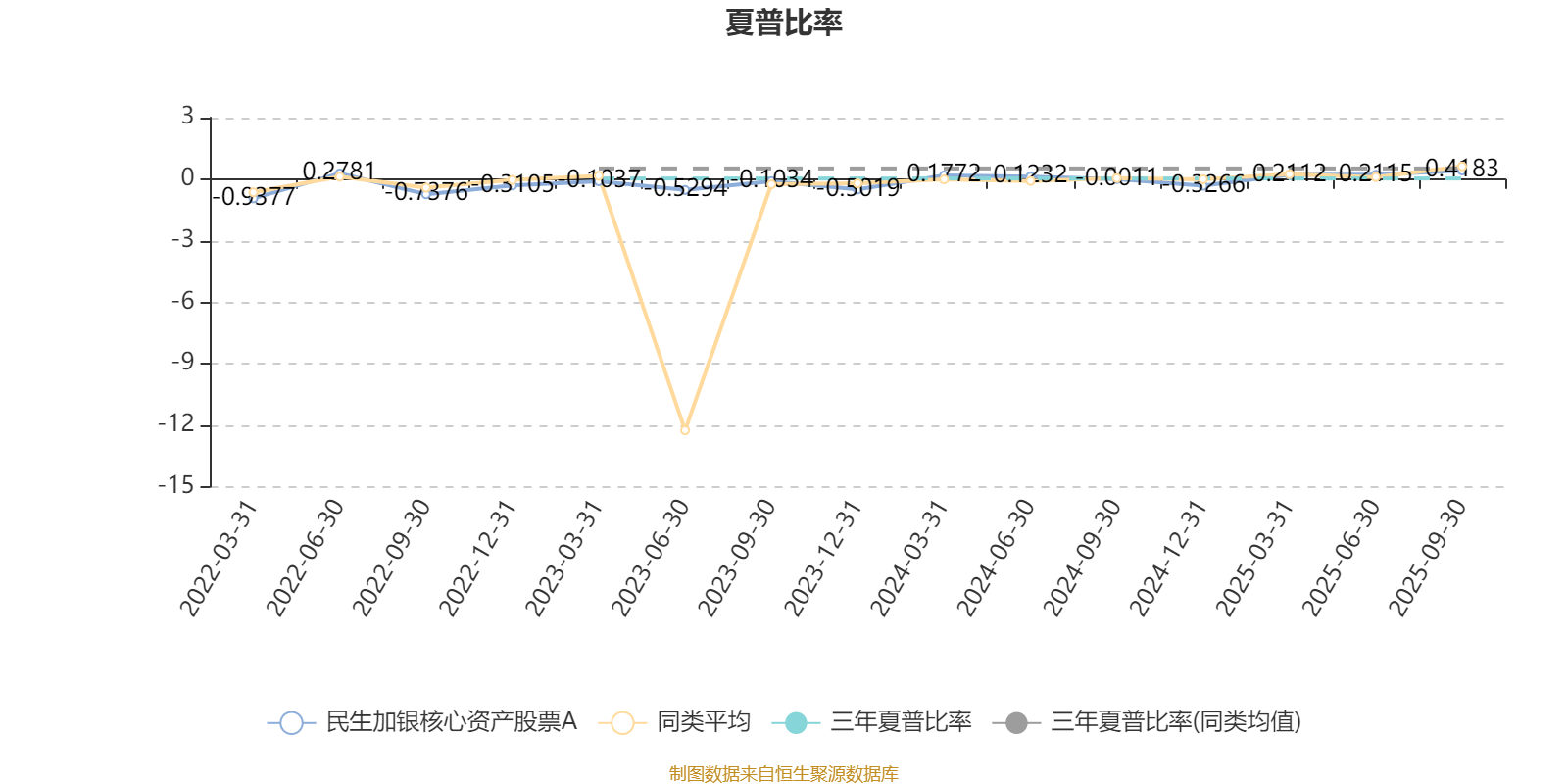 截至9月30日,基金近三年夏普比率为0.0288,位于同类可比基金78/85。