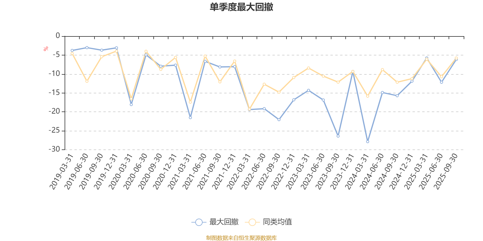 截至10月27日,基金近三年最大回撤为62.12%,同类可比基金排名357/363。单季度最大回撤出现在2024年一季度,为27.9%。