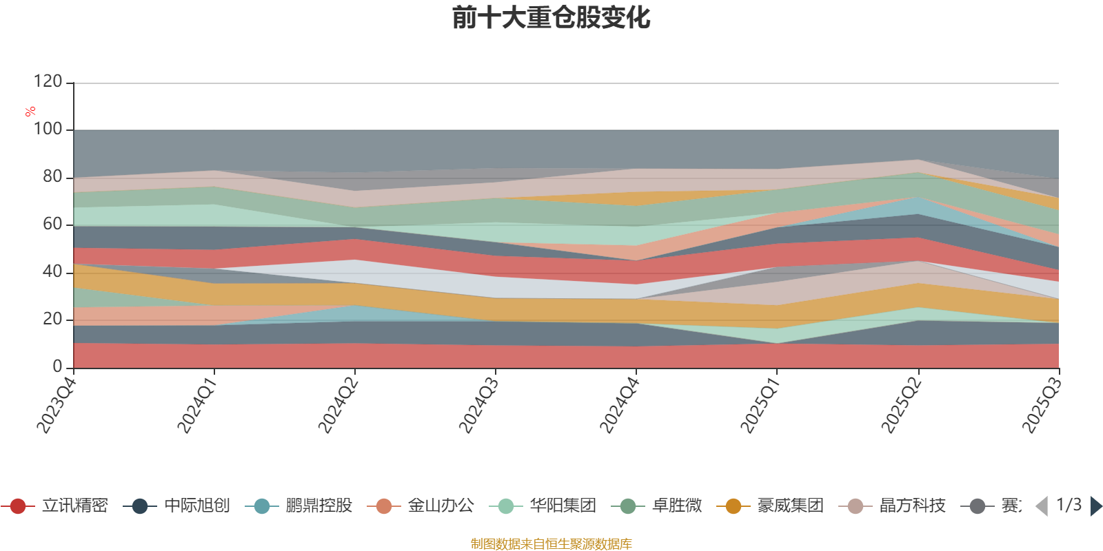 该基金持股集中度较高,近2年前十大重仓股集中度长期超过60%。截至2025年三季度末,基金十大重仓股分别是立讯精密、豪威集团、新易盛、德赛西威、中际旭创、兆易创新、歌尔股份、拓普集团、瑞芯微、沪电股份。