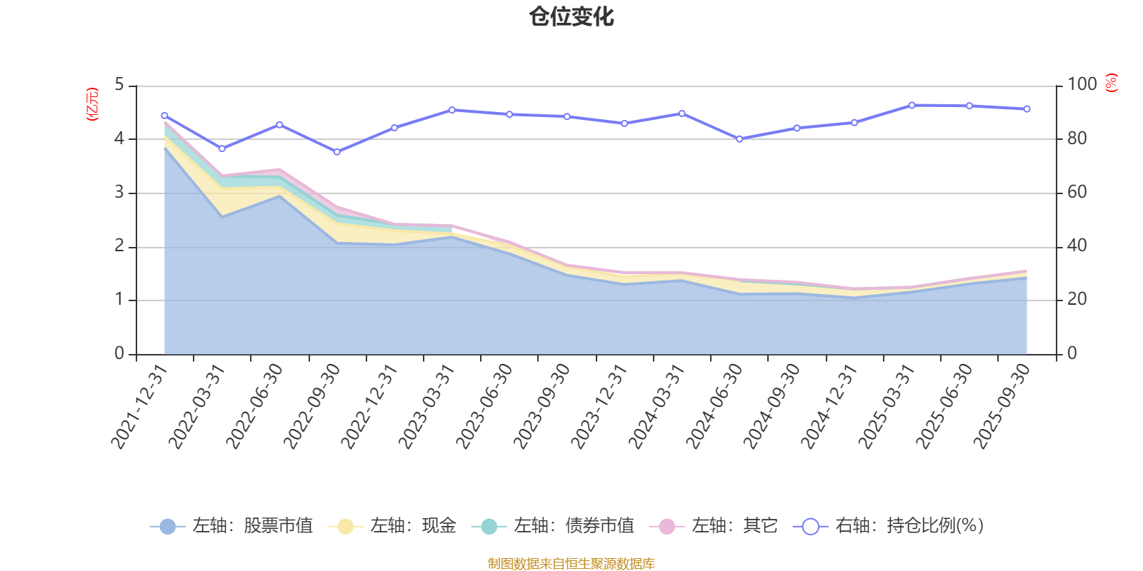 据定期报告数据统计,近三年平均股票仓位为87.99%,同类平均为85.66%。2025年一季度末基金达到92.7%的最高仓位,2022年三季度末最低,为75.35%。
