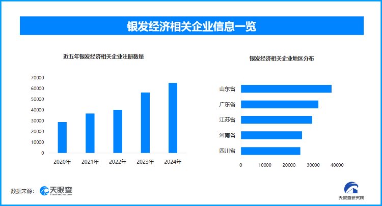 天眼查专业版数据显示,截至目前我国现存在业、存续状态的银发经济相关企业超39.5万家。其中,2025年截至目前新增注册相关企业约6.1万余家,从企业注册数量趋势来看,近五年间,银发经济相关企业的注册数量呈现出逐年增长的态势。从区域分布来看,山东省、广东省、江苏省银发经济相关企业数量位居前列,分别为超3.7万余家、3.2万余家和2.9万余家。
