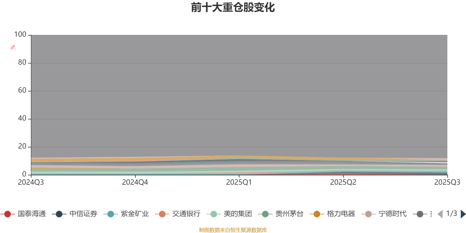 截至2025年三季度末,基金十大重仓股分别是贵州茅台、中信证券、宁德时代、紫金矿业、美的集团、药明康德、兴业银行、中芯国际、京东方A、寒武纪。