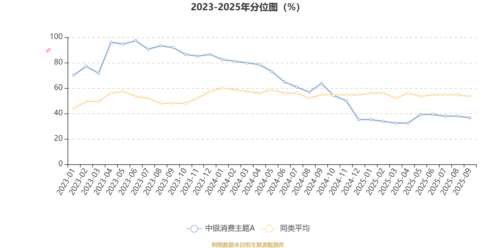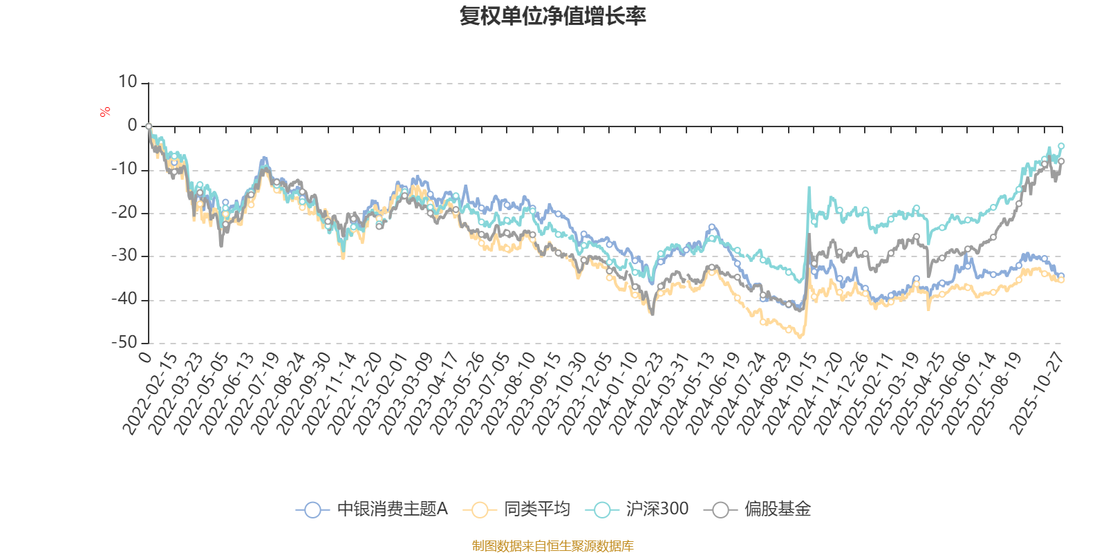 截至10月27日,中银消费主题A近三个月复权单位净值增长率为-1.73%,位于同类可比基金69/85;近半年复权单位净值增长率为2.53%,位于同类可比基金61/85;近一年复权单位净值增长率为-2.52%,位于同类可比基金77/82;近三年复权单位净值增长率为-10.81%,位于同类可比基金58/74。