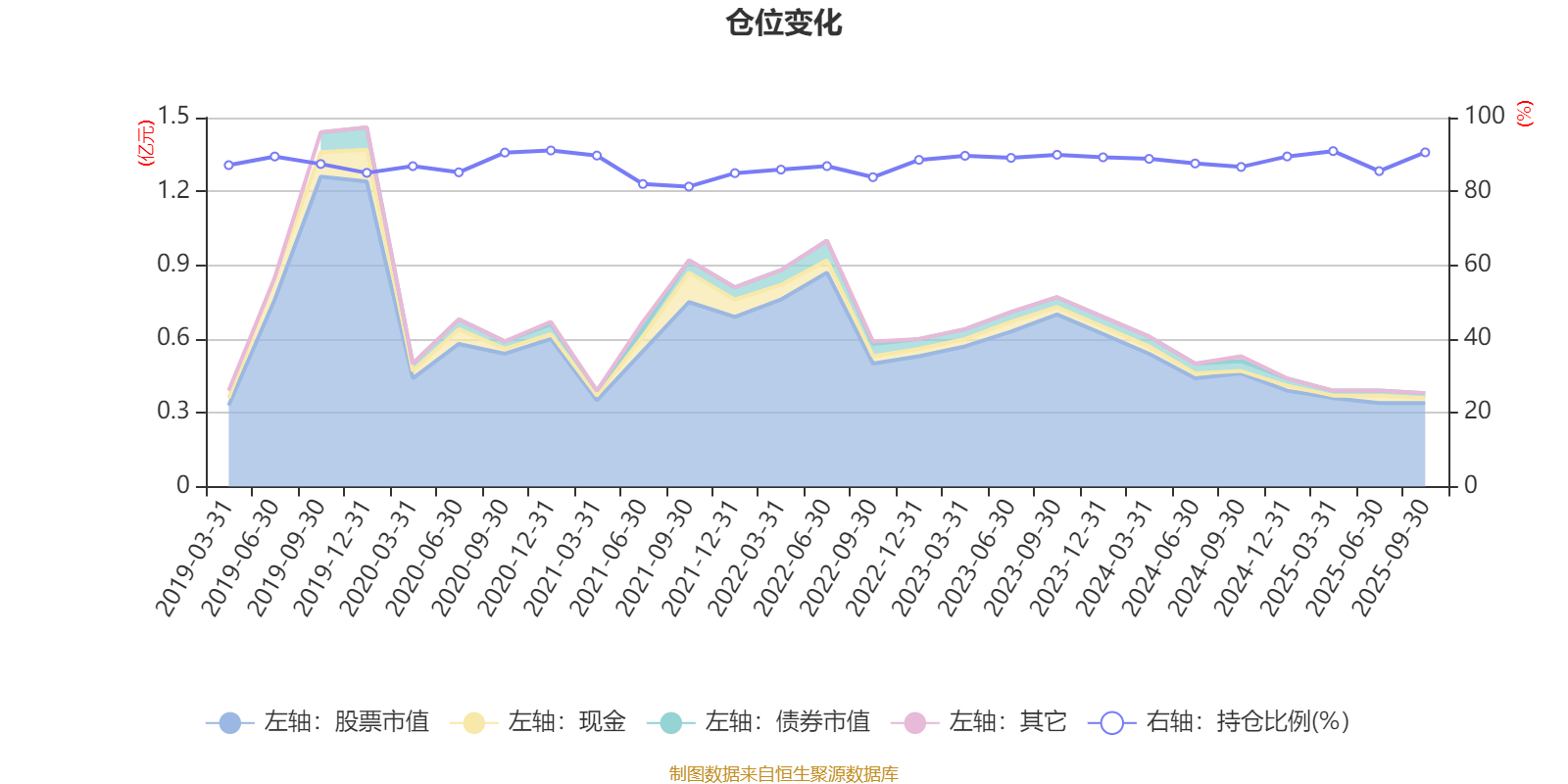 据定期报告数据统计,近三年平均股票仓位为88.83%,同类平均为87.29%。2020年末基金达到91.09%的最高仓位,2021年三季度末最低,为81.3%。