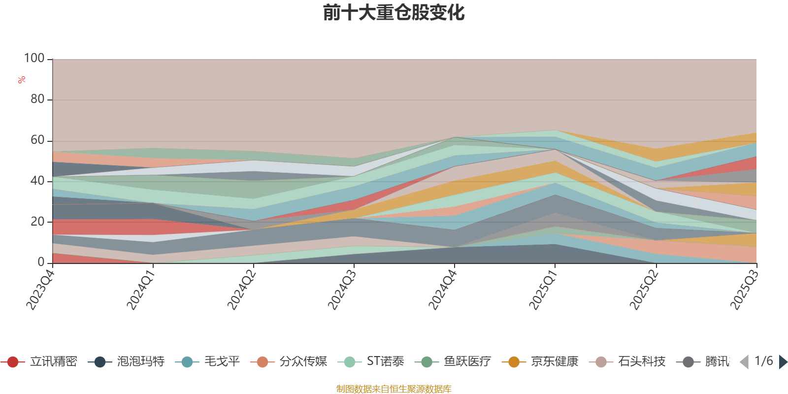该基金持股集中度较高。截至2025年三季度末,基金十大重仓股分别是分众传媒、阿里巴巴-W、恒瑞医药、达势股份、圆通速递、京东健康、中宠股份、科沃斯、大麦娱乐、周大福。