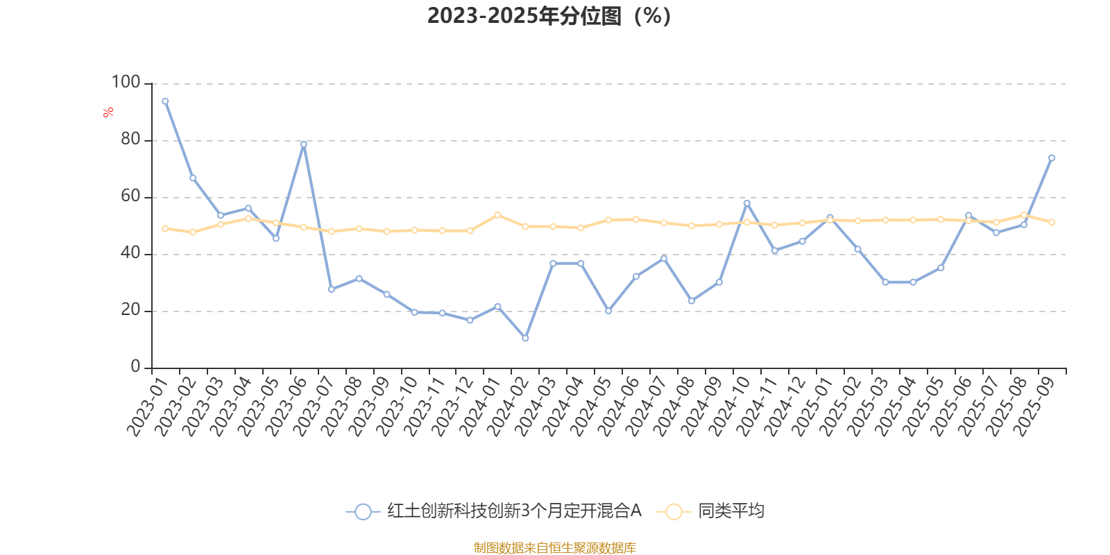 通过所选区间该基金净值增长率分位图,可以观察该基金与同类基金业绩比较情况。图为坐标原点到区间内某时点的净值增长率在同类基金中的分位数。
