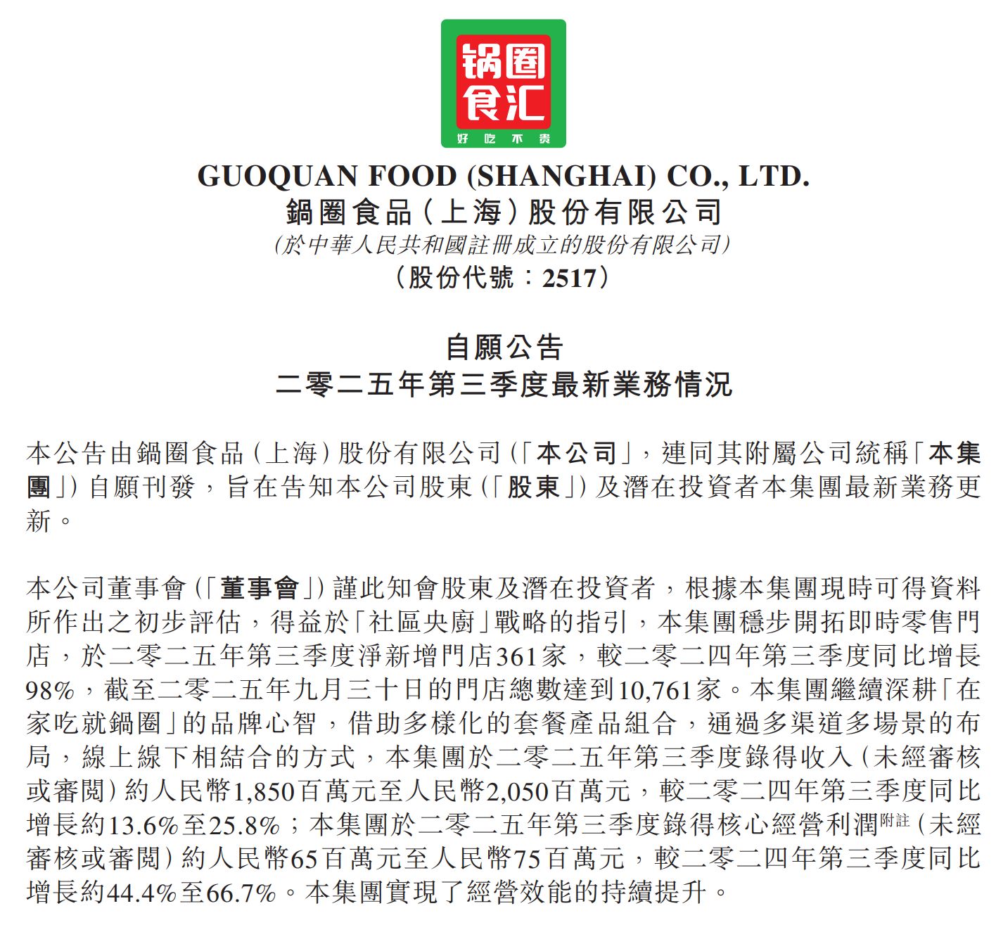 10月28日,锅圈发布的2025年第三季度最新营运情况显示,公司第三季度预计实现营业收入18.5亿至20.5亿元,同比增长13.6%至25.8%;核心经营利润达6500万至7500万元,同比增长44.4%至66.7%。值得一提的是,报告期内,锅圈净新增门店361家,较2024年同期增长98%。截至2025年9月30日,锅圈门店总数达到10761家。