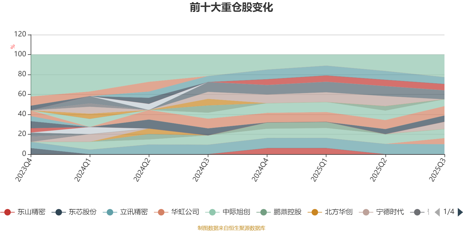 该基金持股集中度较高。截至2025年三季度末,基金十大重仓股分别是立讯精密、歌尔股份、中际旭创、新易盛、宁德时代、沪电股份、水晶光电、蓝思科技、豪威集团、华虹公司。