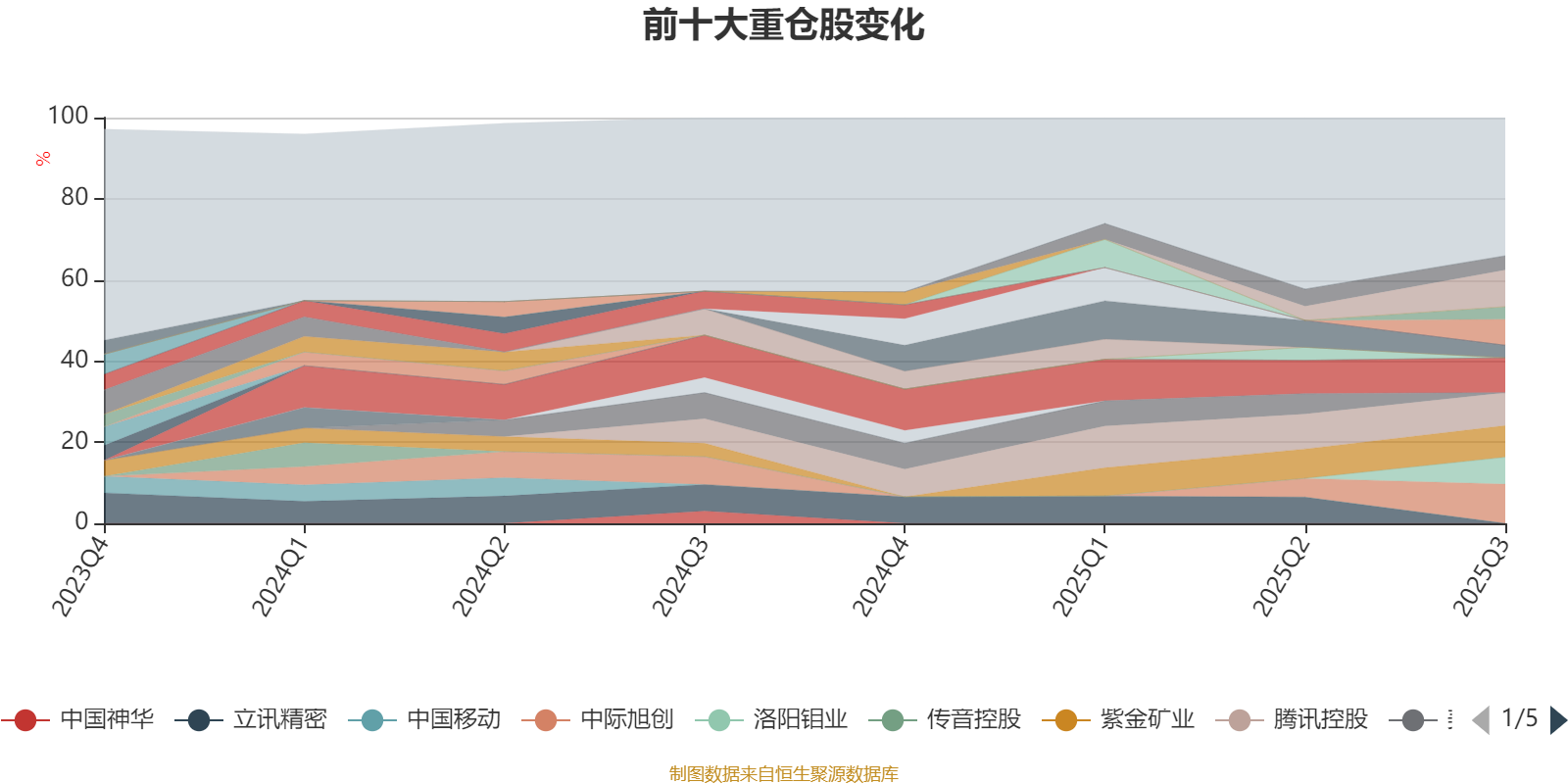 截至2025年三季度末,基金十大重仓股分别是中际旭创、新易盛、宁德时代、腾讯控股、紫金矿业、洛阳钼业、亿纬锂能、纽威股份、阿里巴巴-W、小米集团-W。