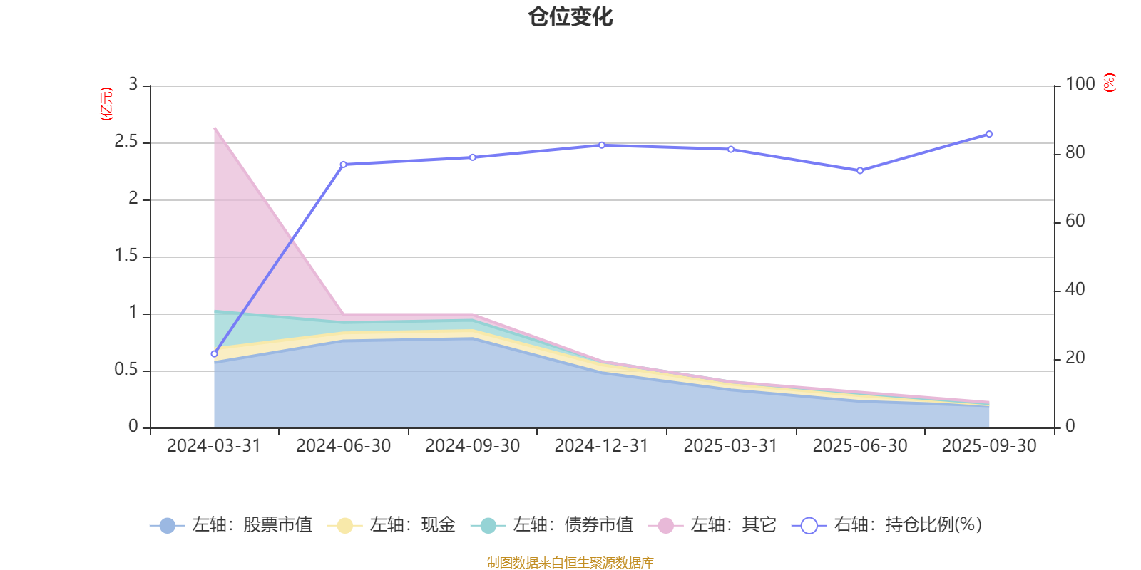 据定期报告数据统计,成立以来平均股票仓位为71.75%,同类平均为87.09%。2025年三季度末基金达到85.81%的最高仓位,2024年一季度末最低,为21.54%。