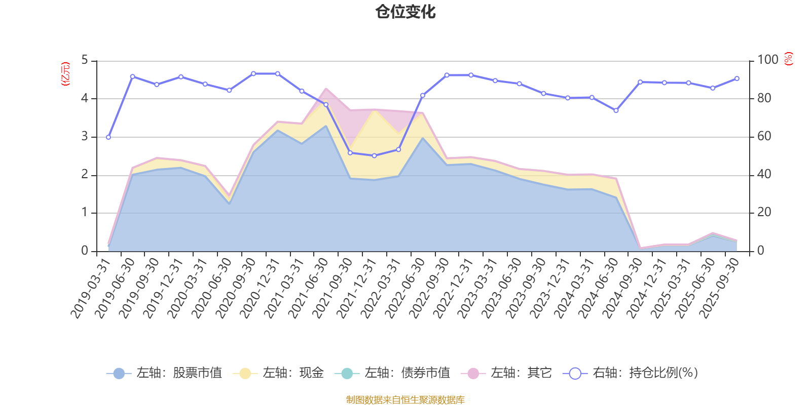 据定期报告数据统计,近三年平均股票仓位为85.84%,同类平均为83.73%。2020年三季度末基金达到93.26%的最高仓位,2021年末最低,为50.19%。