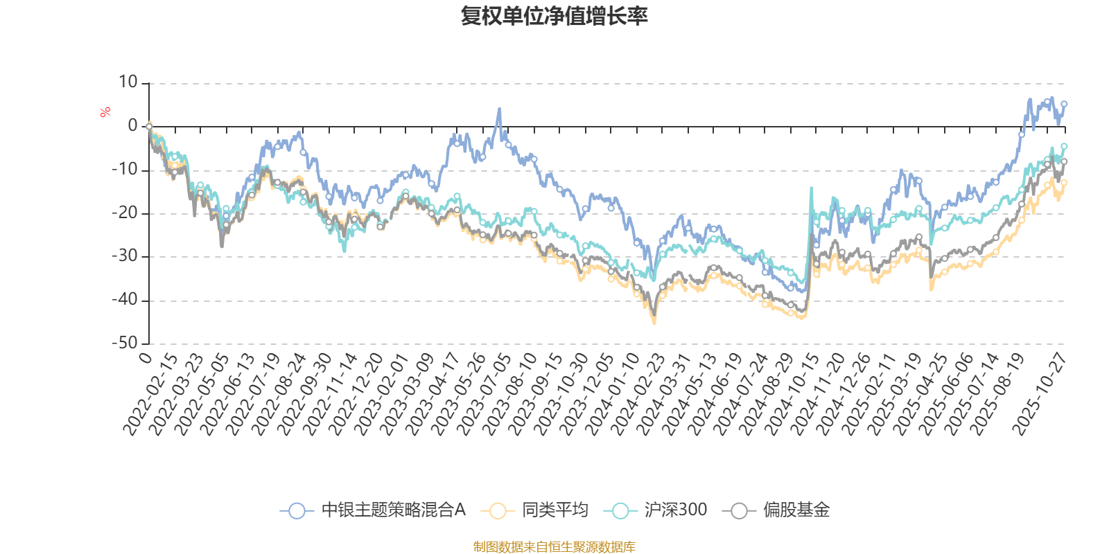 截至10月27日,中银主题策略混合A近三个月复权单位净值增长率为16.90%,位于同类可比基金78/185;近半年复权单位净值增长率为29.15%,位于同类可比基金96/185;近一年复权单位净值增长率为38.58%,位于同类可比基金53/181;近三年复权单位净值增长率为25.54%,位于同类可比基金69/175。