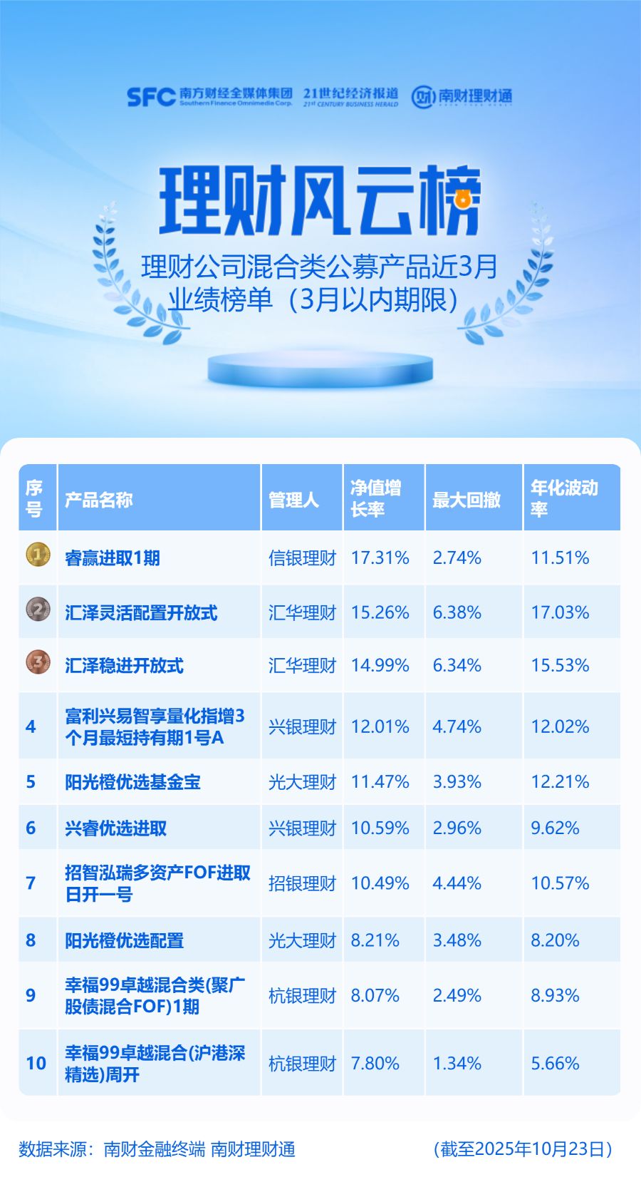 混合类产品范围为理财公司发行的投资周期在3月以内(含)的公募混合类产品,统计截止日期为2025年10月23日,统计区间为近3月。