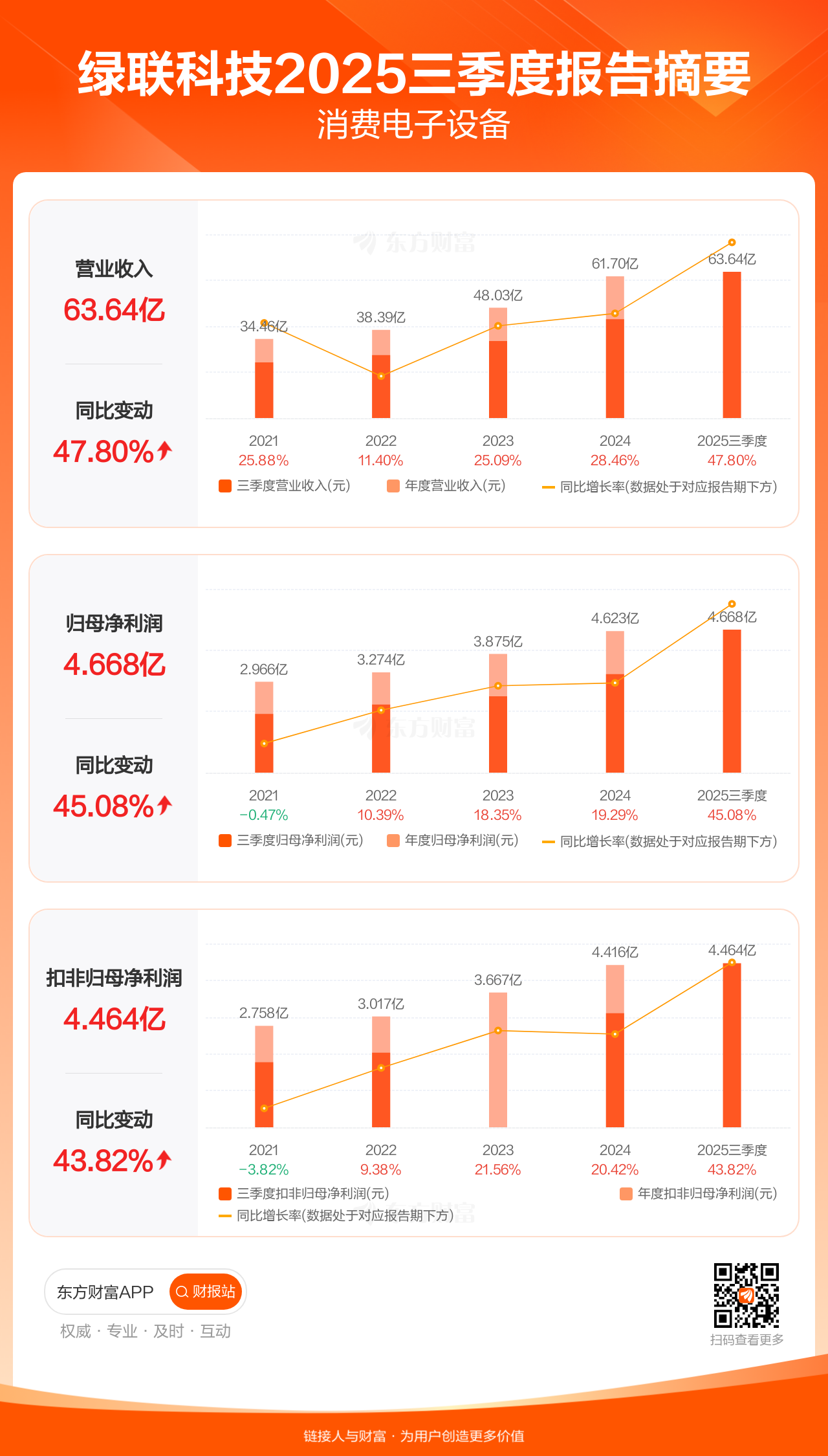 绿联科技10月25日发布2025年三季报显示,公司前三季实现营业收入63.64亿元,同比增长47.80%;归母净利润4.67亿元,同比增长45.08%;扣非归母净利润4.46亿元,同比增长43.82%。