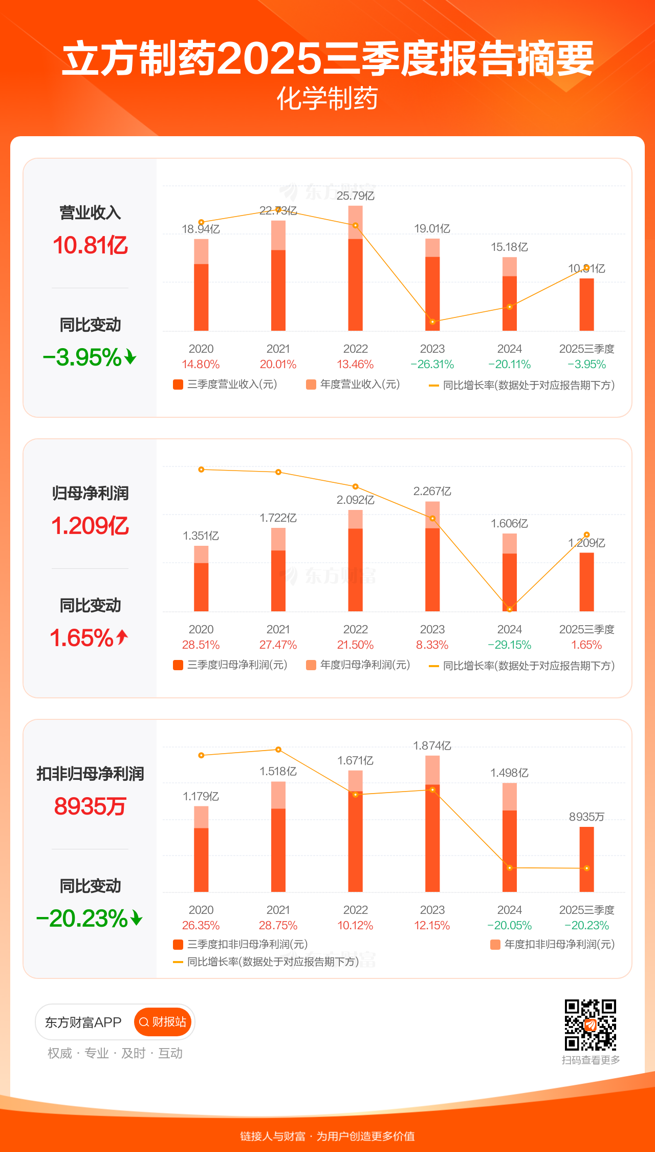 立方制药10月30日发布2025年三季报显示,公司前三季实现营业收入10.81亿元,同比下滑3.95%;归母净利润1.21亿元,同比增长1.65%;扣非归母净利润8935.46万元,同比下滑20.23%。