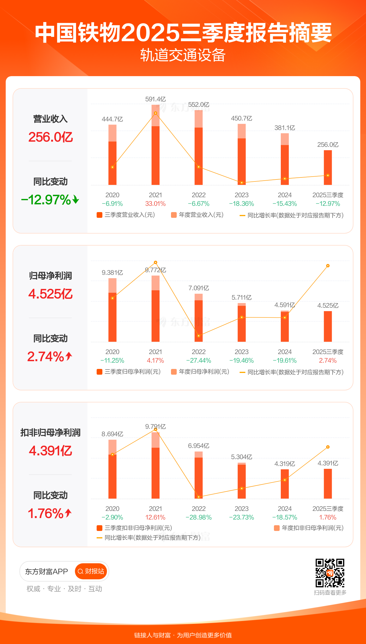 中国铁物10月30日发布2025年三季报显示,公司前三季实现营业收入255.97亿元,同比下滑12.97%;归母净利润4.53亿元,同比增长2.74%;扣非归母净利润4.39亿元,同比增长1.76%。