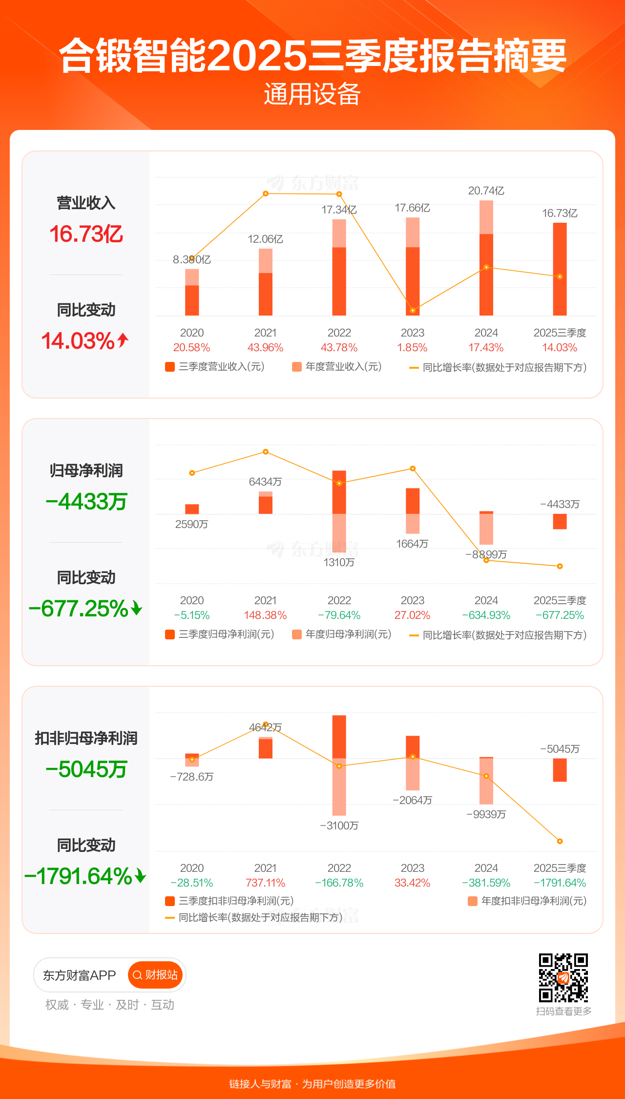 合锻智能10月30日发布2025年三季报显示,公司前三季实现营业收入16.73亿元,同比增长14.03%;归母净利润-4432.77万元;扣非归母净利润-5045.24万元。