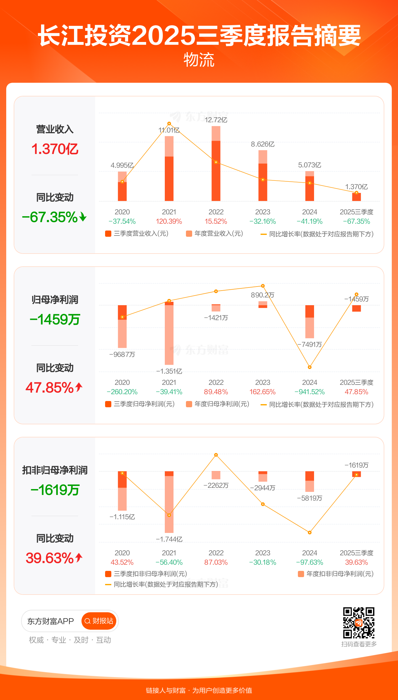 长江投资10月30日发布2025年三季报显示,公司前三季实现营业收入1.37亿元,同比下滑67.35%;归母净利润-1458.97万元;扣非归母净利润-1618.89万元。