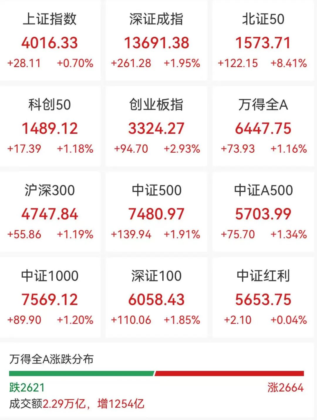 10月29日,A股市场全天震荡拉升,三大指数高开高走,截至收盘,沪指涨0.7%,深成指涨1.95%,创业板指涨近3%创年内新高,北证50指数涨超8%。