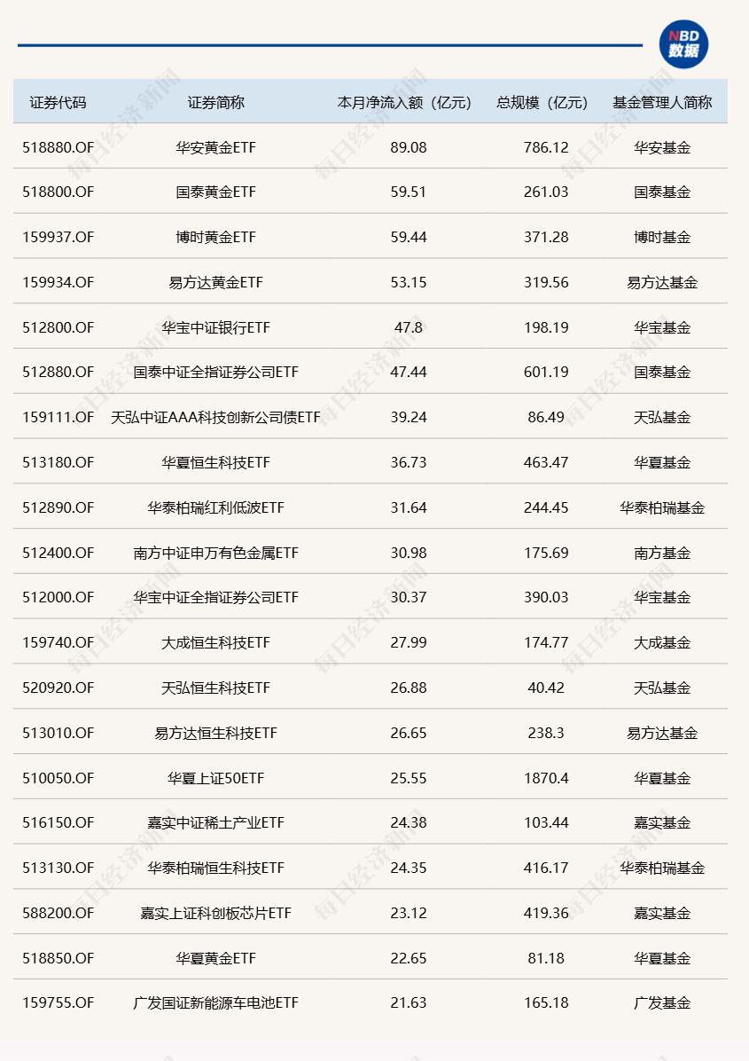 截至10月28日,本月资金净流入额居前20的ETF名单如下: