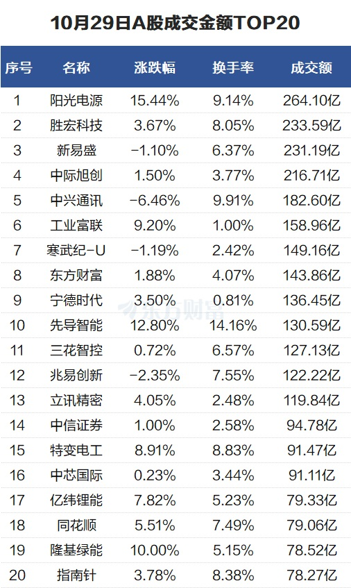 活跃个股:阳光电源成交264亿元 泰凯英换手率70%