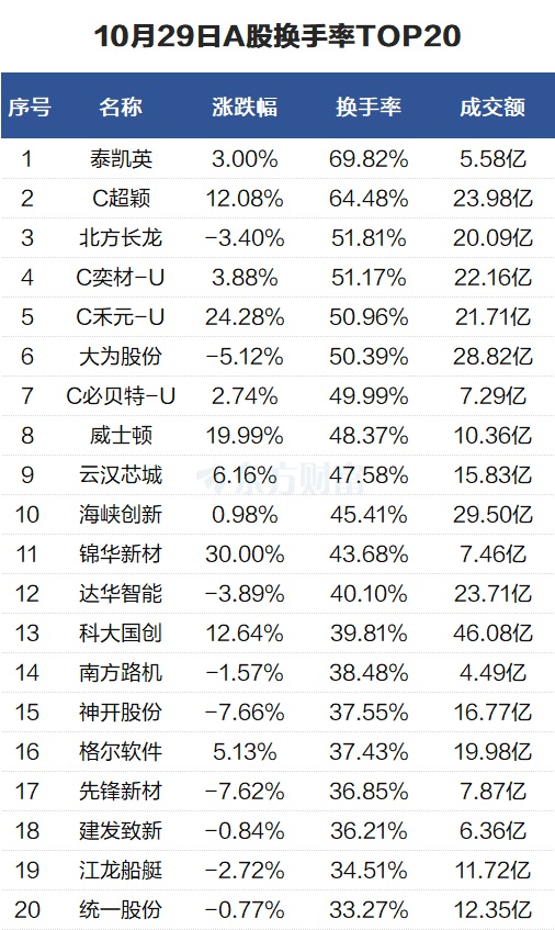 当天换手率最高的个股为泰凯英,全天换手率69.82%。C超颖紧随其后,全天换手率64.48%。