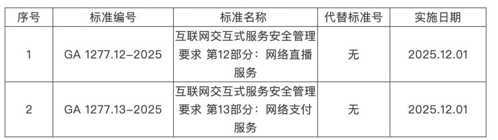 每经AI快讯,近日,公安部发布的2025年第1号《中华人民共和国公安部公共安全行业标准公告》,由公安部信息系统安全标准化技术委员会归口的8项公共安全行业标准正式发布。其中强制标准包括《互联网交互式服务安全管理要求第12部分:网络直播服务》《互联网交互式服务安全管理要求第13部分:网络支付服务》,以上强制性标准将于2025年12月1日起正式实施。其他6项推荐性标准将于2026年2月1日起正式实施。