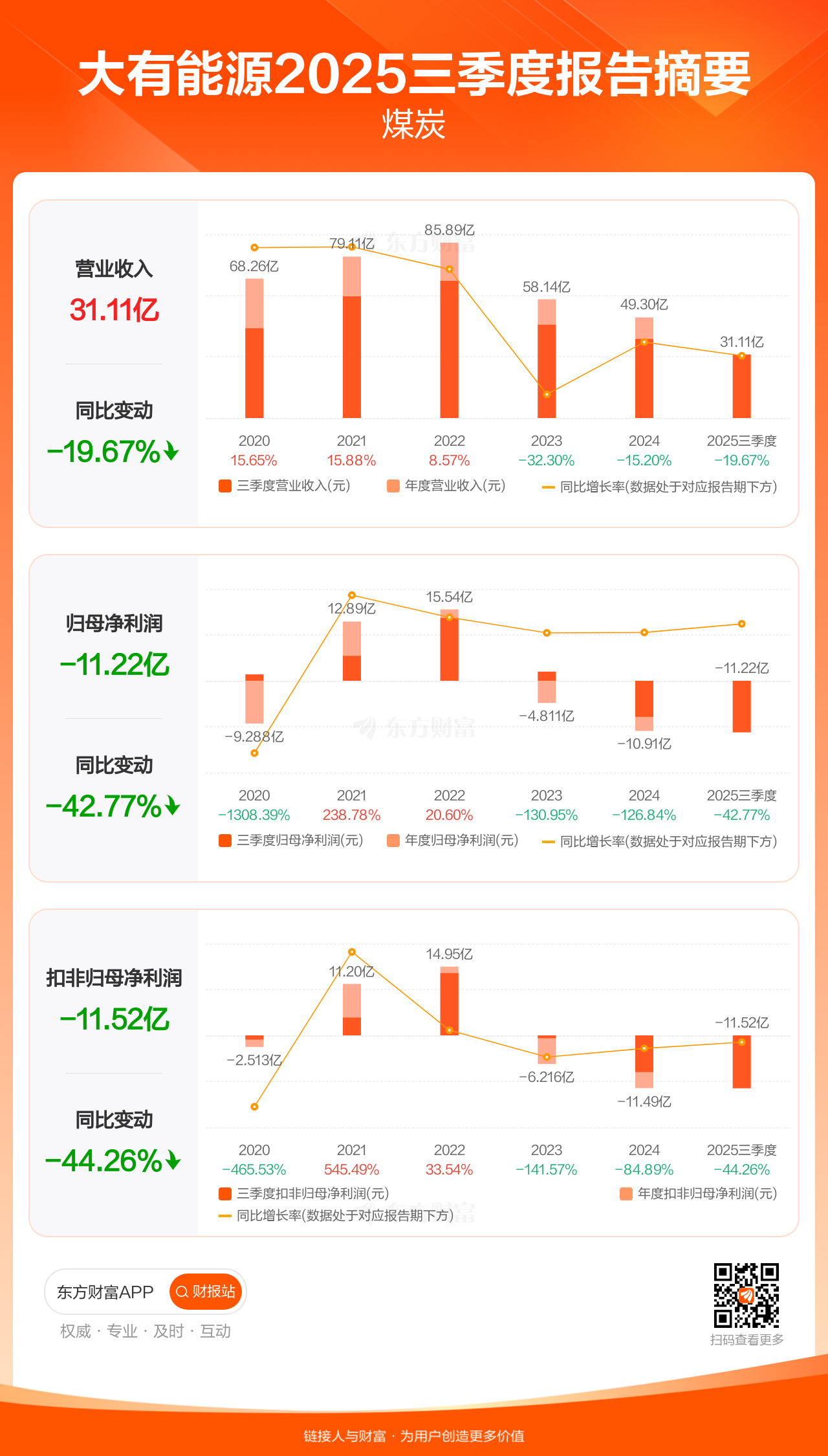 大有能源10月30日发布2025年三季报显示,公司前三季实现营业收入31.11亿元,同比下滑19.67%;归母净利润-11.22亿元;扣非归母净利润-11.52亿元。