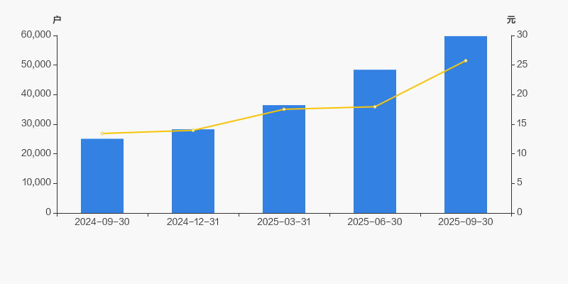 自2024年9月30日以来,公司股东户数连续4期上涨,截至目前增幅为138.28%。2024年9月30日至2025年9月30日区间股价上涨91.60%。