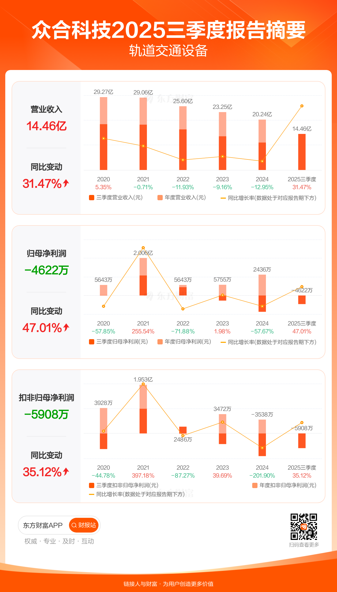 众合科技10月30日发布2025年三季报显示,公司前三季实现营业收入14.46亿元,同比增长31.47%;归母净利润-4621.56万元;扣非归母净利润-5907.78万元。