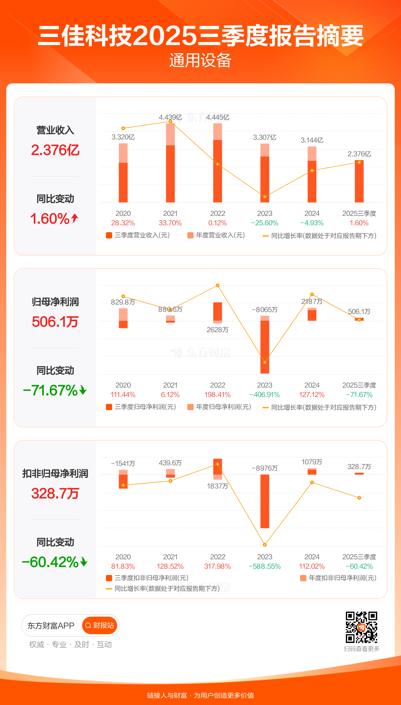 三佳科技10月30日发布2025年三季报显示,公司前三季实现营业收入2.38亿元,同比增长1.60%;归母净利润506.09万元,同比下滑71.67%;扣非归母净利润328.72万元,同比下滑60.42%。