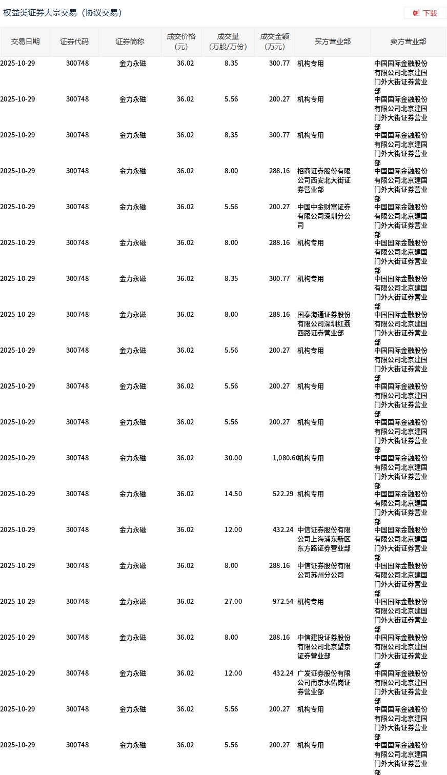 金力永磁今日大宗交易折价成交298.03万股,成交额1.07亿元
