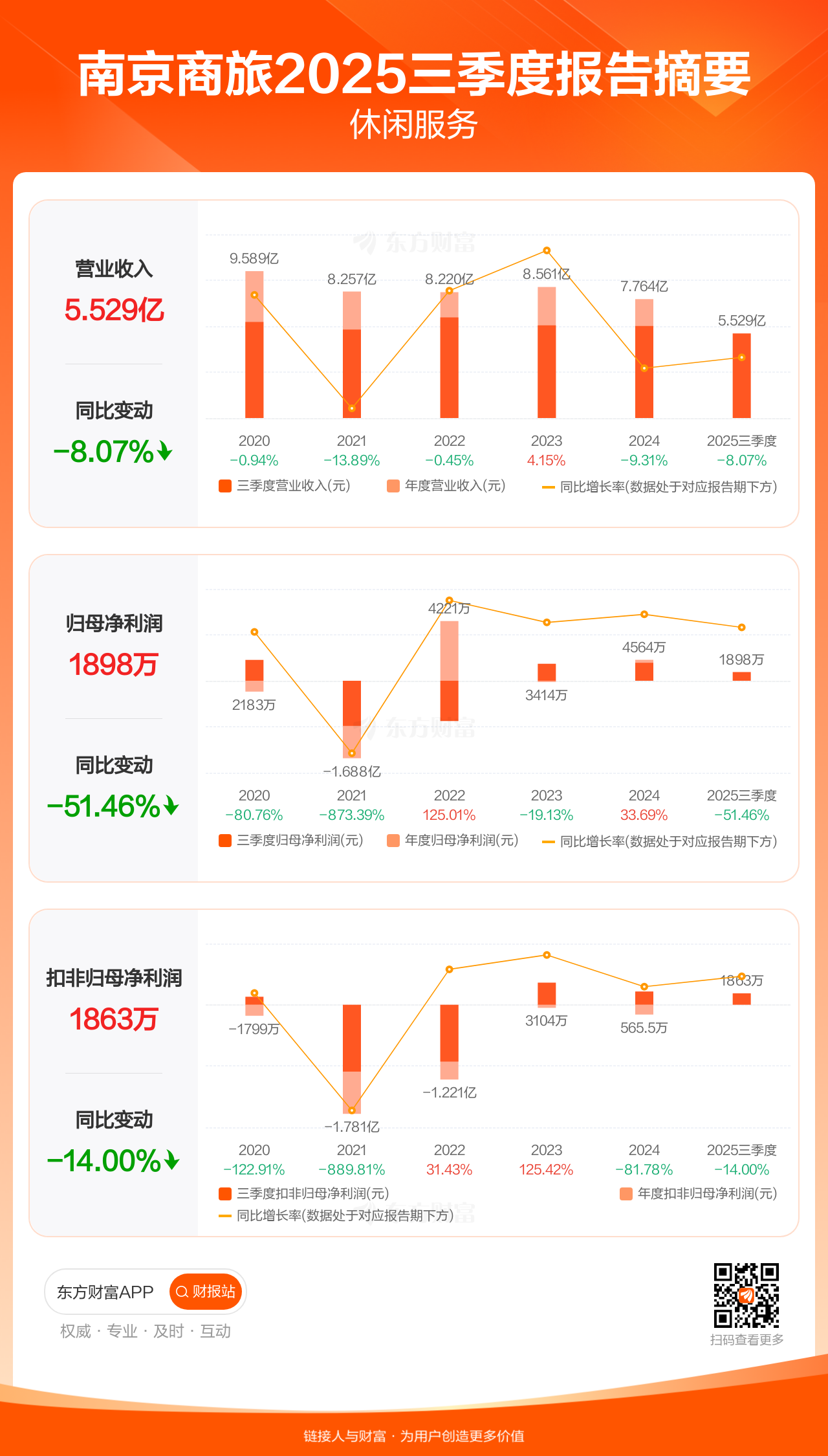 南京商旅10月30日发布2025年三季报显示,公司前三季实现营业收入5.53亿元,同比下滑8.07%;归母净利润1897.74万元,同比下滑51.46%;扣非归母净利润1862.58万元,同比下滑14.00%。