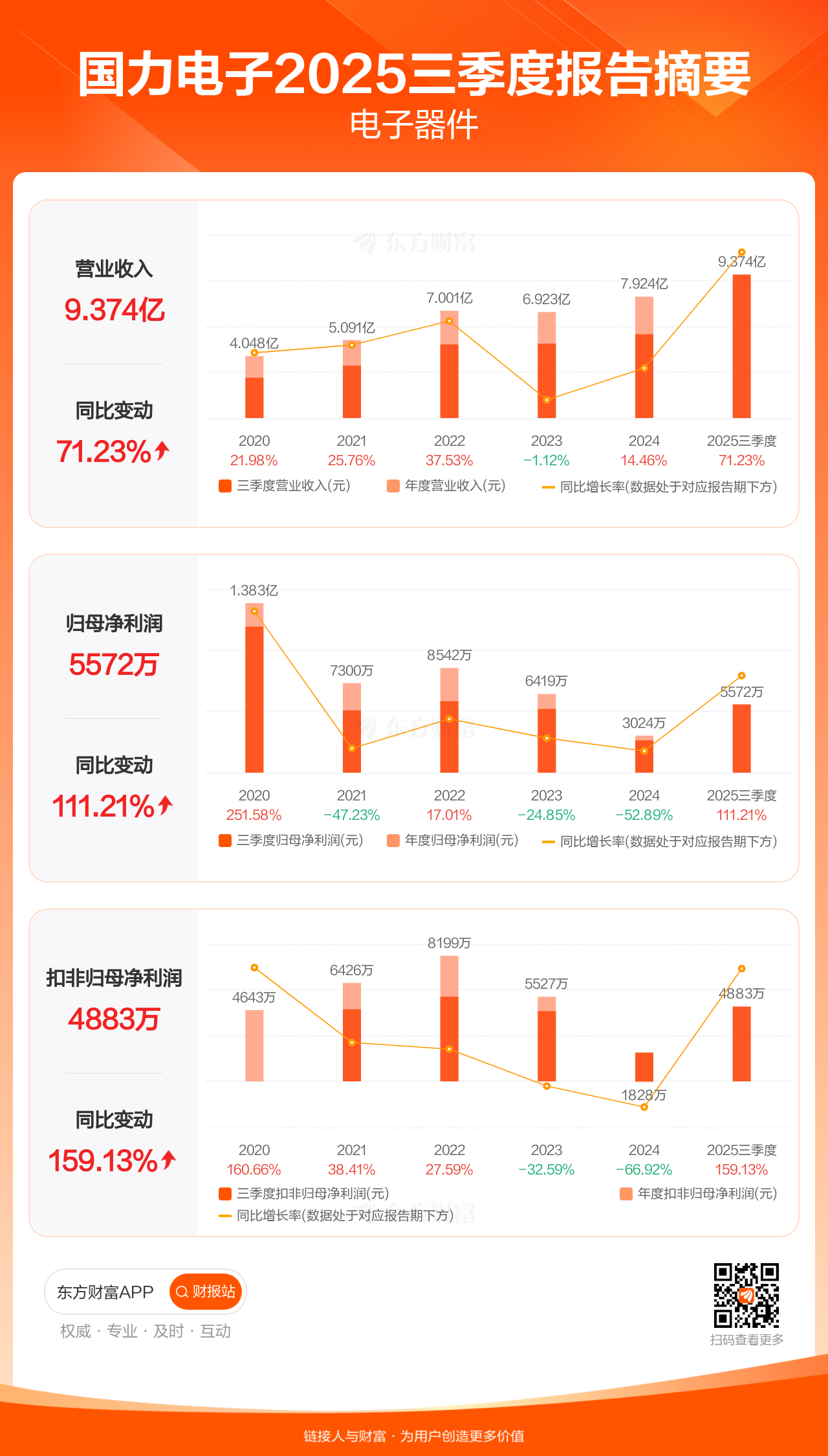国力电子10月30日发布2025年三季报显示,公司前三季实现营业收入9.37亿元,同比增长71.23%;归母净利润5571.75万元,同比增长111.21%;扣非归母净利润4882.68万元,同比增长159.13%。