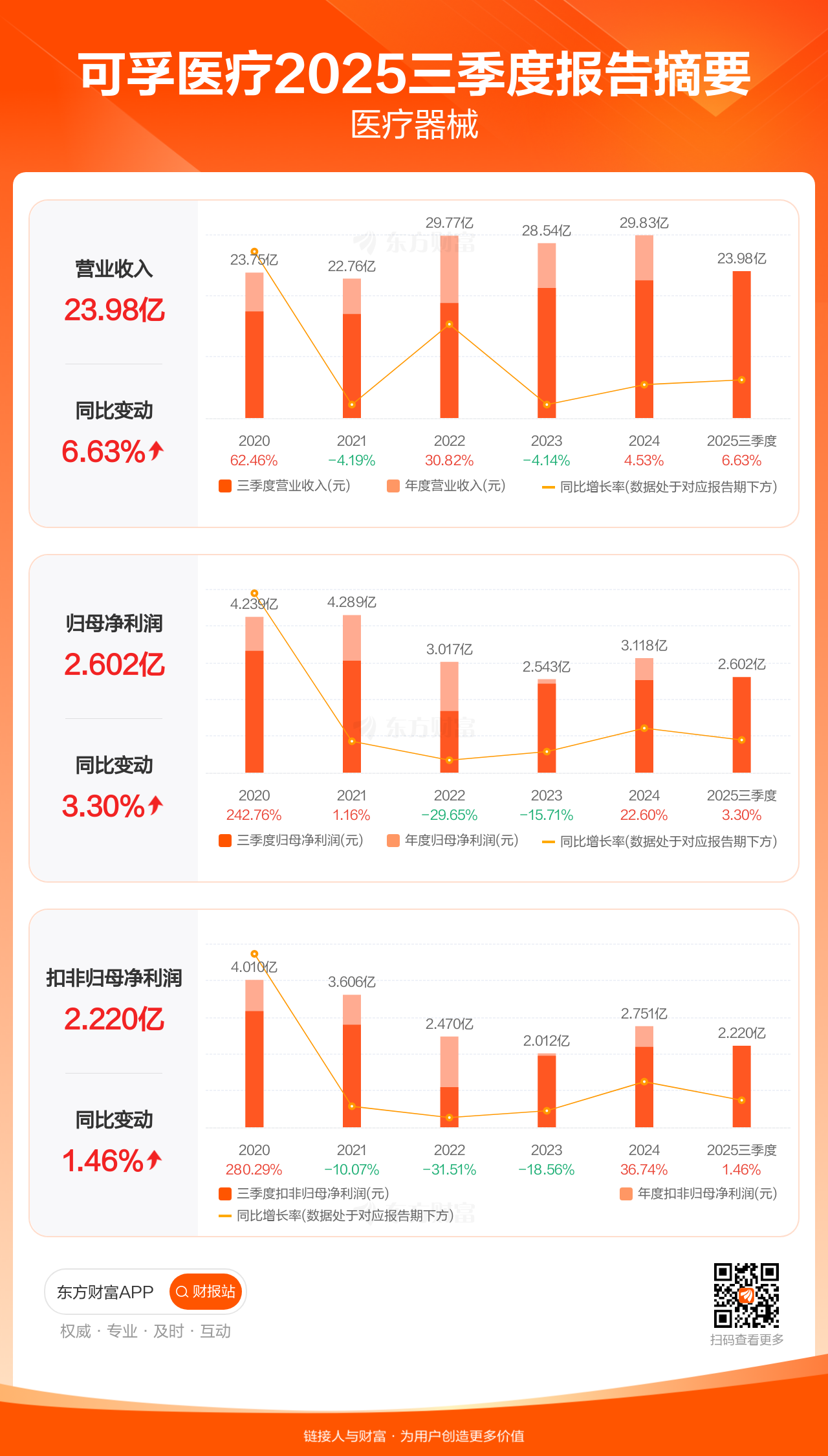 可孚医疗10月30日发布2025年三季报显示,公司前三季实现营业收入23.98亿元,同比增长6.63%;归母净利润2.60亿元,同比增长3.30%;扣非归母净利润2.22亿元,同比增长1.46%。