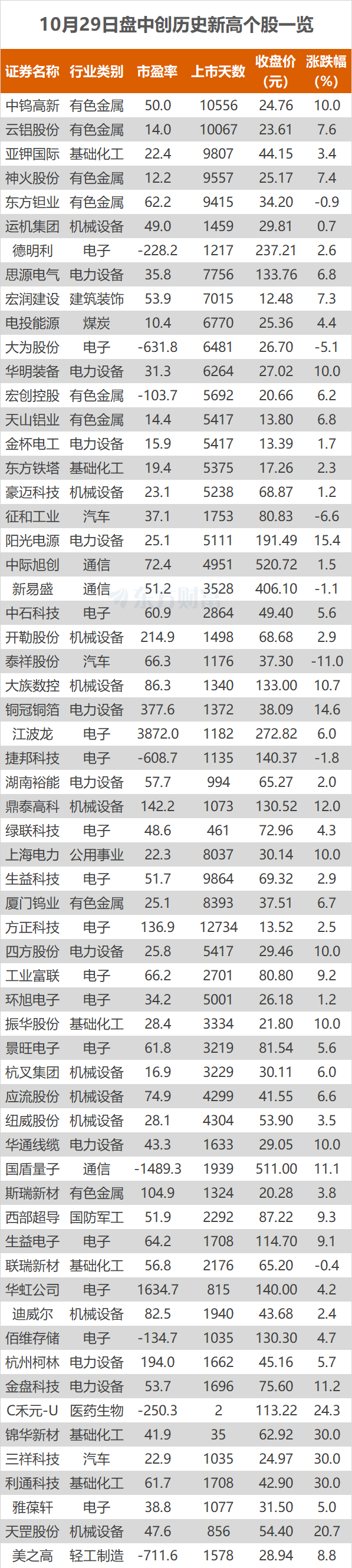 10月29日,A股主要指数今日集体上涨,沪指收盘站上4000点大关。截止收盘,沪指涨0.70%,收报4016.33点;深证成指涨1.95%,收报13691.38点;创业板指涨2.93%,收报3324.27点;北证50指数涨8.41%,收报1573.71点。东方财富Choice数据显示,今日有61只个股盘中股价创历史新高,分别为工业富联、阳光电源等。