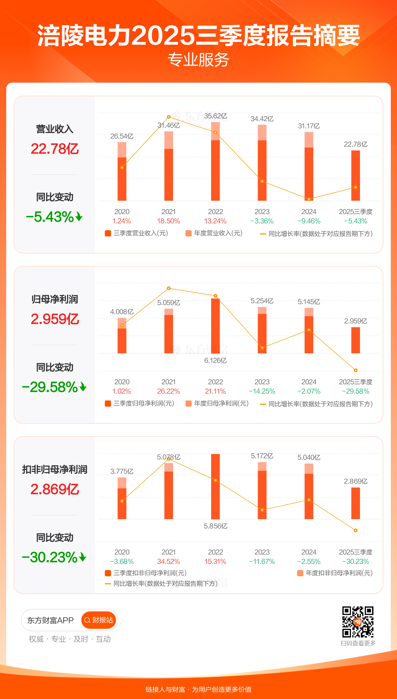 涪陵电力10月30日发布2025年三季报显示,公司前三季实现营业收入22.78亿元,同比下滑5.43%;归母净利润2.96亿元,同比下滑29.58%;扣非归母净利润2.87亿元,同比下滑30.23%。