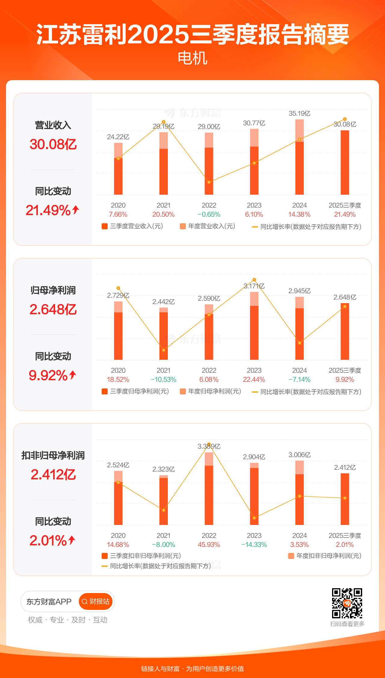 江苏雷利10月30日发布2025年三季报显示,公司前三季实现营业收入30.08亿元,同比增长21.49%;归母净利润2.65亿元,同比增长9.92%;扣非归母净利润2.41亿元,同比增长2.01%。