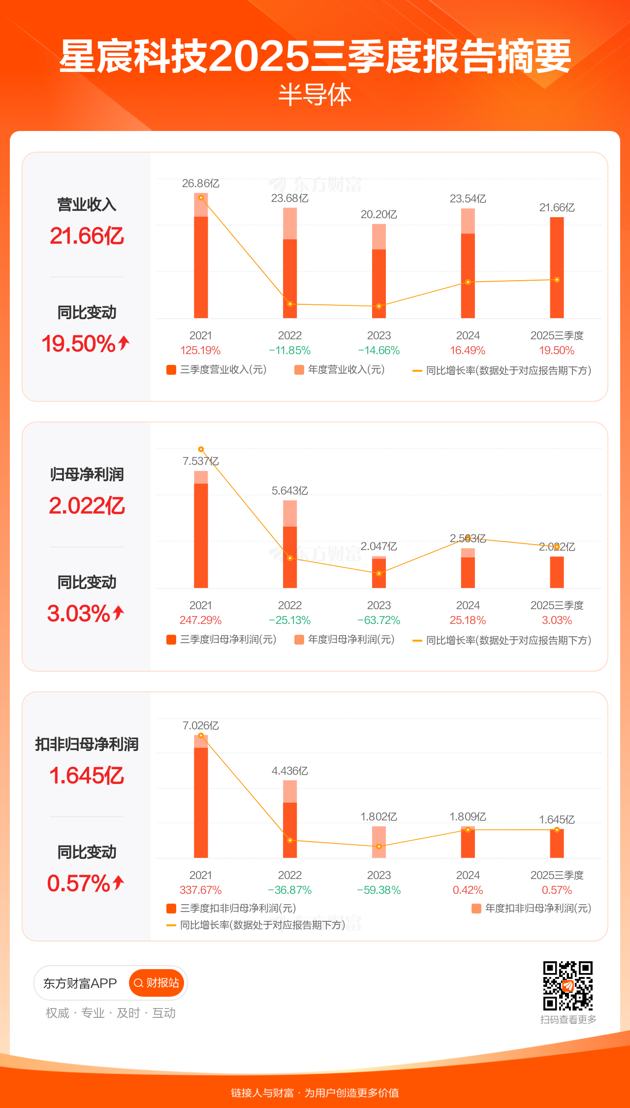 星宸科技10月23日发布2025年三季报显示,公司前三季实现营业收入21.66亿元,同比增长19.50%;归母净利润2.02亿元,同比增长3.03%;扣非归母净利润1.64亿元,同比增长0.57%。