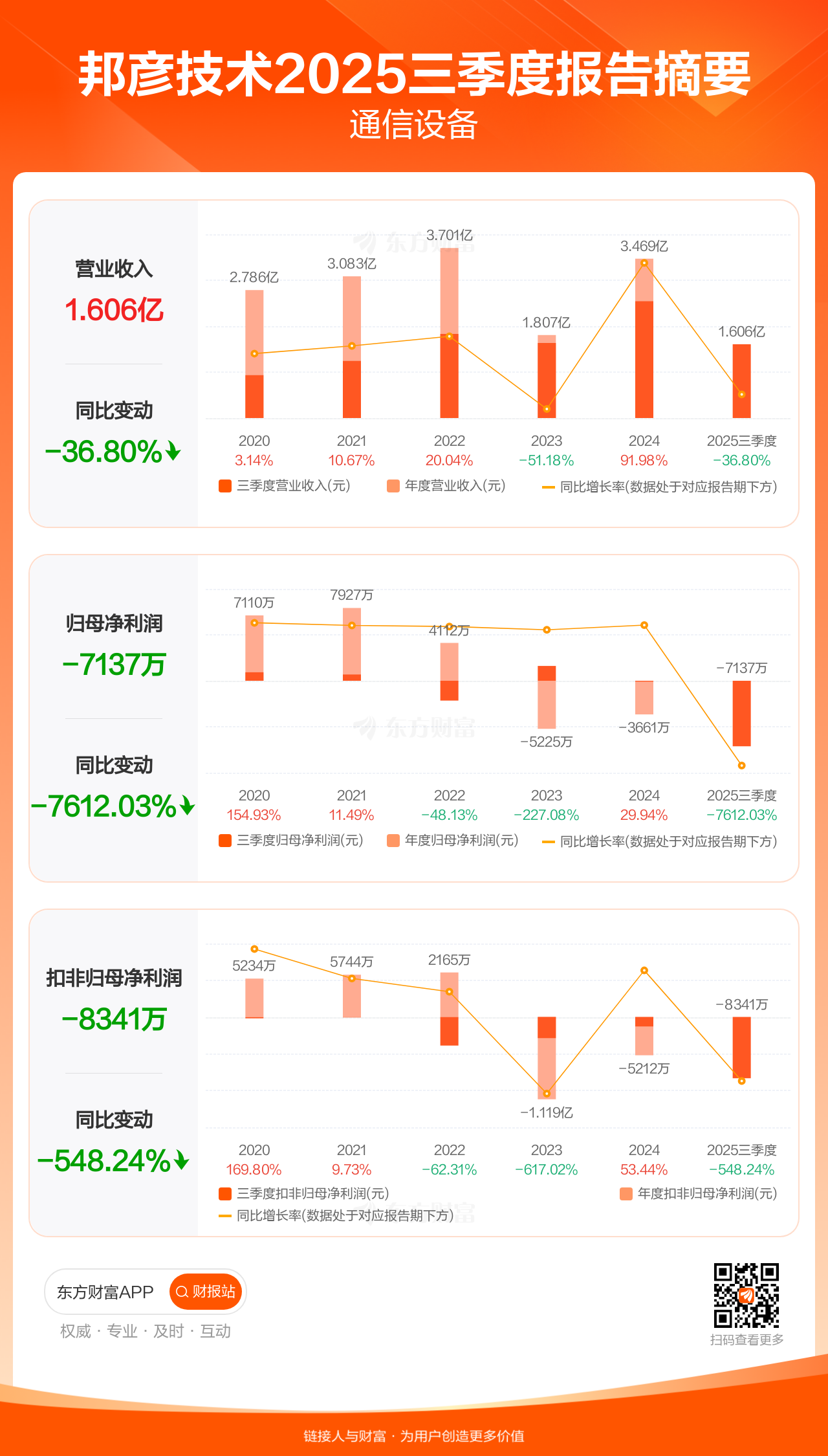 邦彦技术10月30日发布2025年三季报显示,公司前三季实现营业收入1.61亿元,同比下滑36.80%;归母净利润-7136.93万元;扣非归母净利润-8340.80万元。