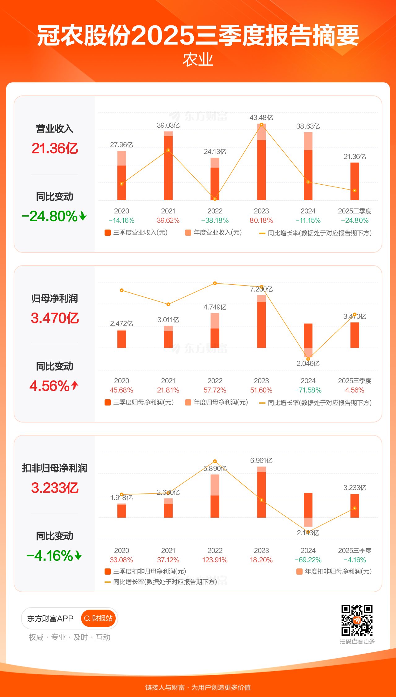 冠农股份10月30日发布2025年三季报显示,公司前三季实现营业收入21.36亿元,同比下滑24.80%;归母净利润3.47亿元,同比增长4.56%;扣非归母净利润3.23亿元,同比下滑4.16%。