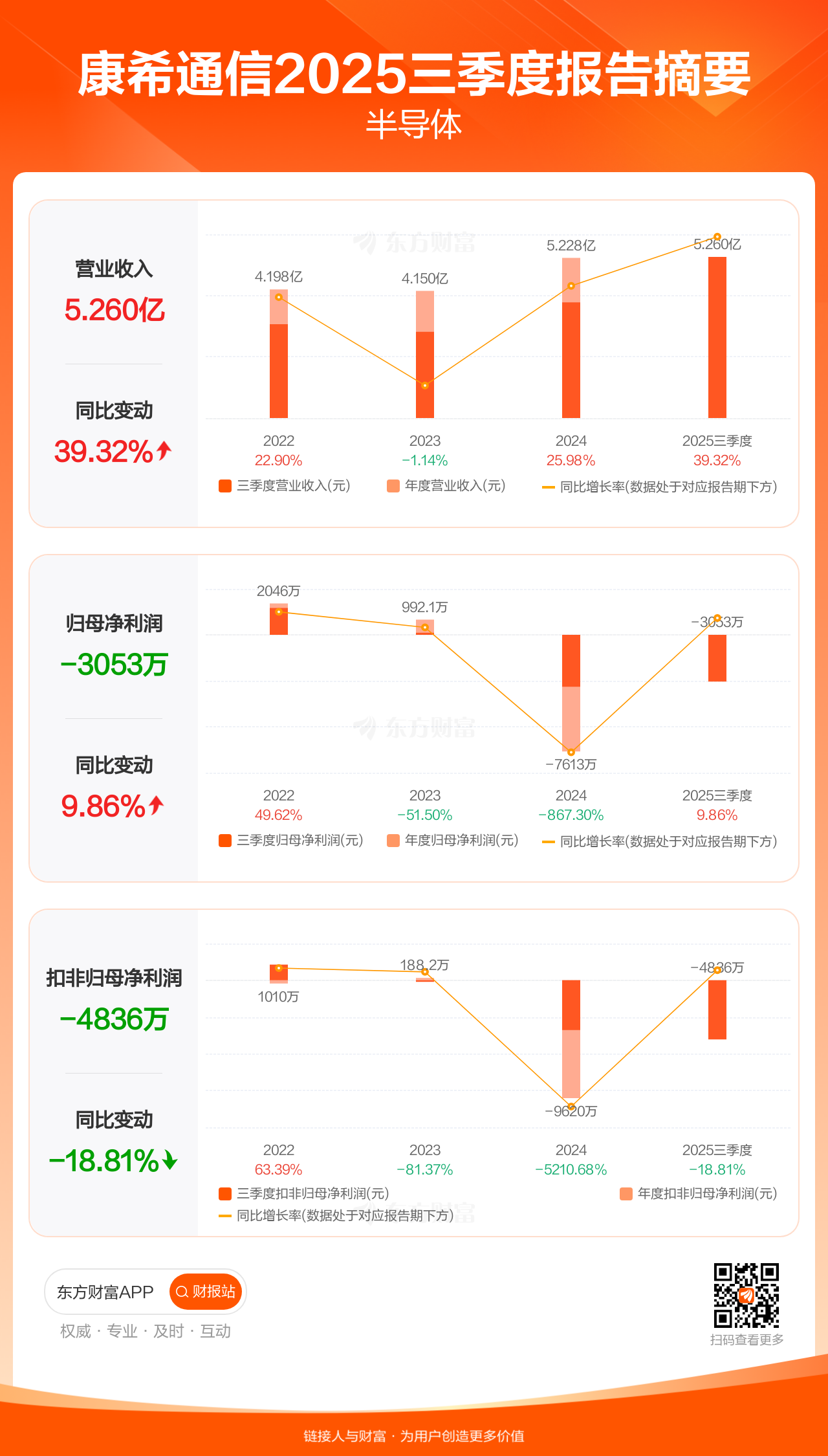 图解财报:康希通信前三季归母净利润-3052.69万元,上年同期-3386.46万元