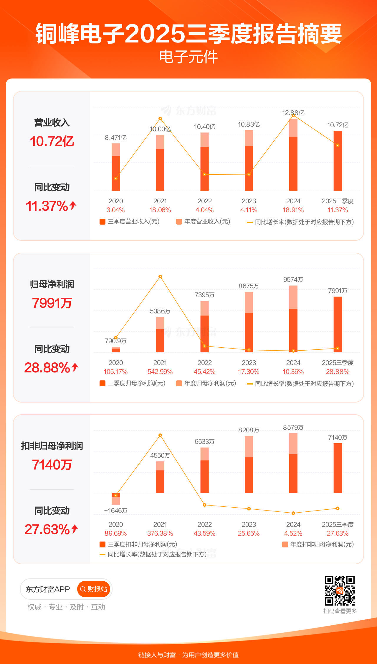 铜峰电子10月30日发布2025年三季报显示,公司前三季实现营业收入10.72亿元,同比增长11.37%;归母净利润7991.04万元,同比增长28.88%;扣非归母净利润7140.37万元,同比增长27.63%。
