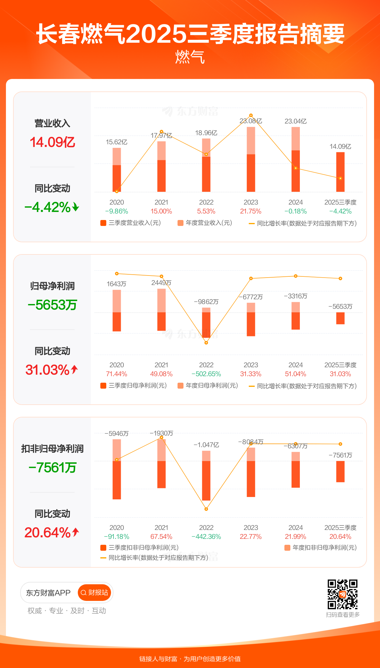 长春燃气10月30日发布2025年三季报显示,公司前三季实现营业收入14.09亿元,同比下滑4.42%;归母净利润-5653.00万元;扣非归母净利润-7560.64万元。
