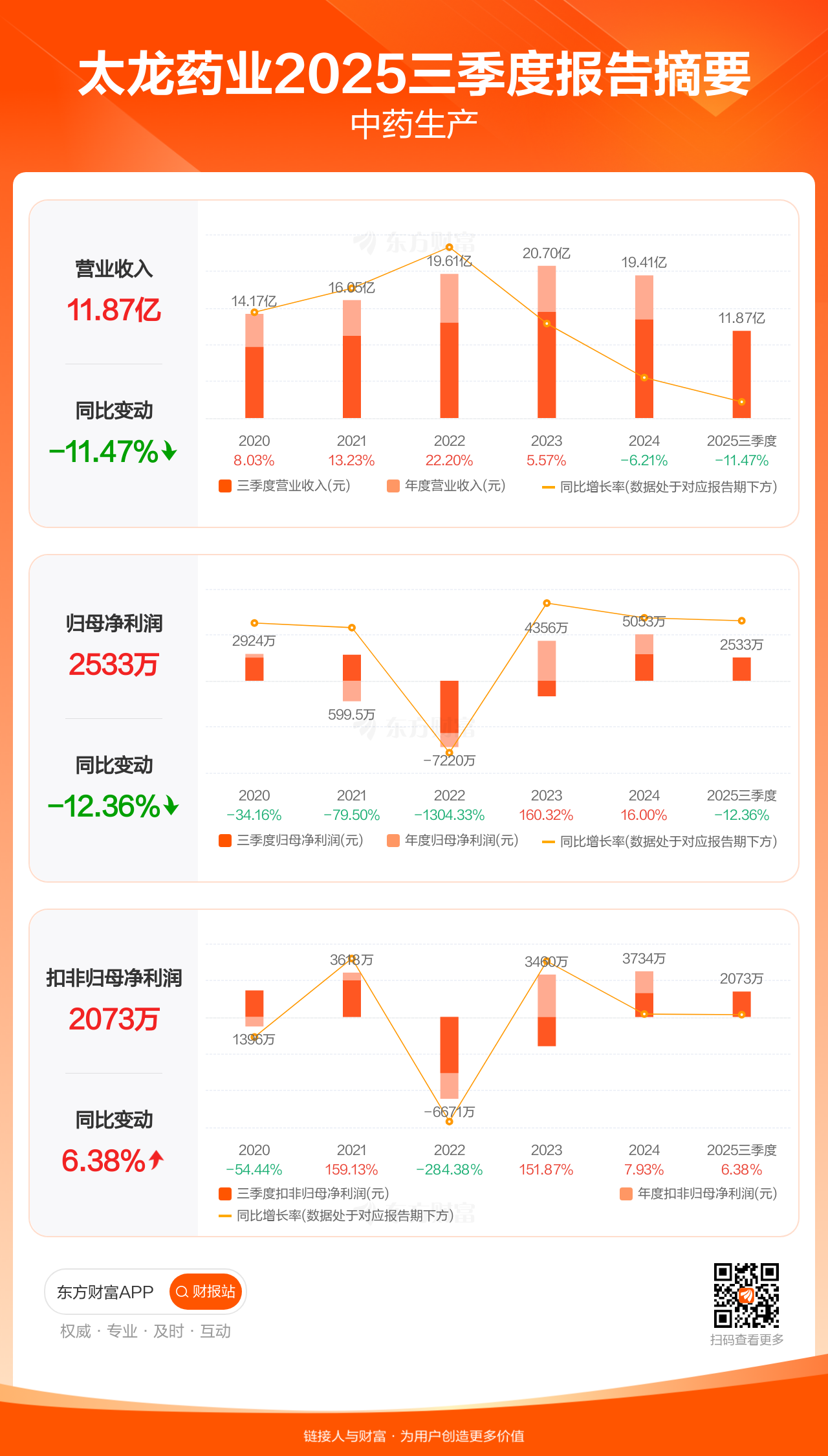图解财报:太龙药业前三季归母净利润2532.55万元,同比减少12.36%