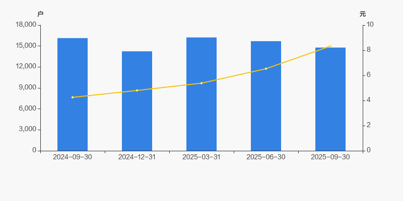 2024年9月30日至今,公司股东户数有所下降,区间跌幅为8.40%。2024年9月30日至2025年9月30日区间股价上涨96.00%。