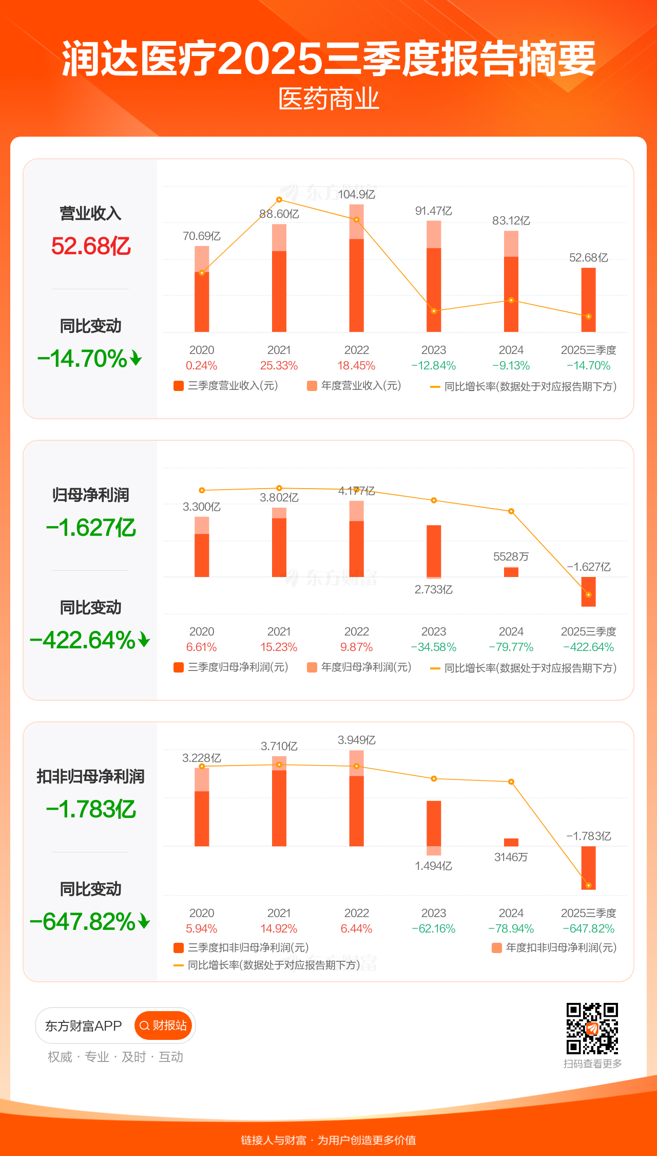 润达医疗10月30日发布2025年三季报显示,公司前三季实现营业收入52.68亿元,同比下滑14.70%;归母净利润-1.63亿元;扣非归母净利润-1.78亿元。