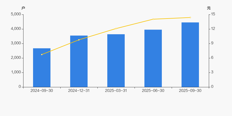 自2024年9月30日以来,公司股东户数连续4期上涨,截至目前增幅为66.88%。2024年9月30日至2025年9月30日区间股价上涨114.35%。