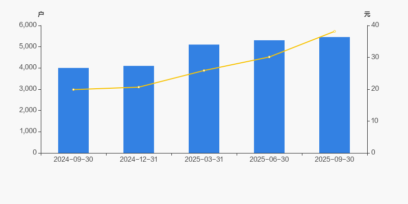 自2024年9月30日以来,公司股东户数连续4期上涨,截至目前增幅为36.32%。2024年9月30日至2025年9月30日区间股价上涨91.87%。